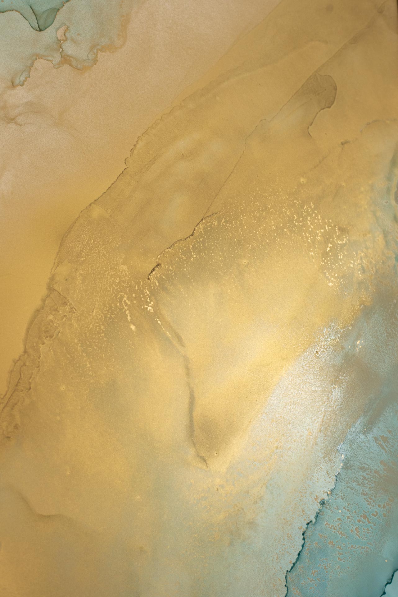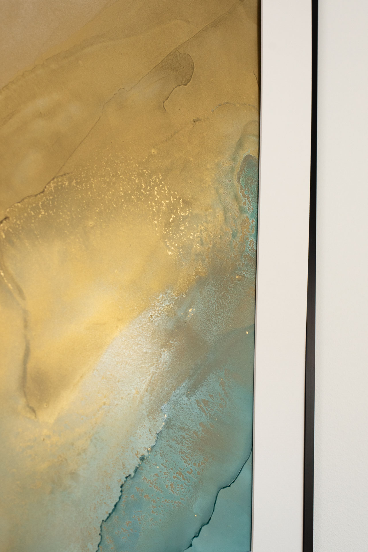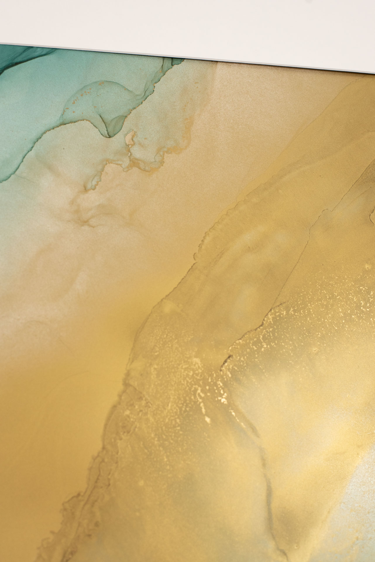 Obraz inspirowany złotym piaskiem w Dubaju i wyprawą na pustynne wydmy. Oryginalny obraz malowany tuszami alkoholowymi na papierze syntetycznym. Wokół obrazu jest białe passe-partout o neutralnym PH, zapobiega to przebarwieniu obrazu. Passe-partout nie żółknie, ponieważ jest bezkwasowe. Obraz oprawiony w czarną, cienką ramkę o metalowych brzegach z profilem tworzącym cień. Przednia osłona jest bezpieczna i nie zmienia ani nie zniekształca obrazu.