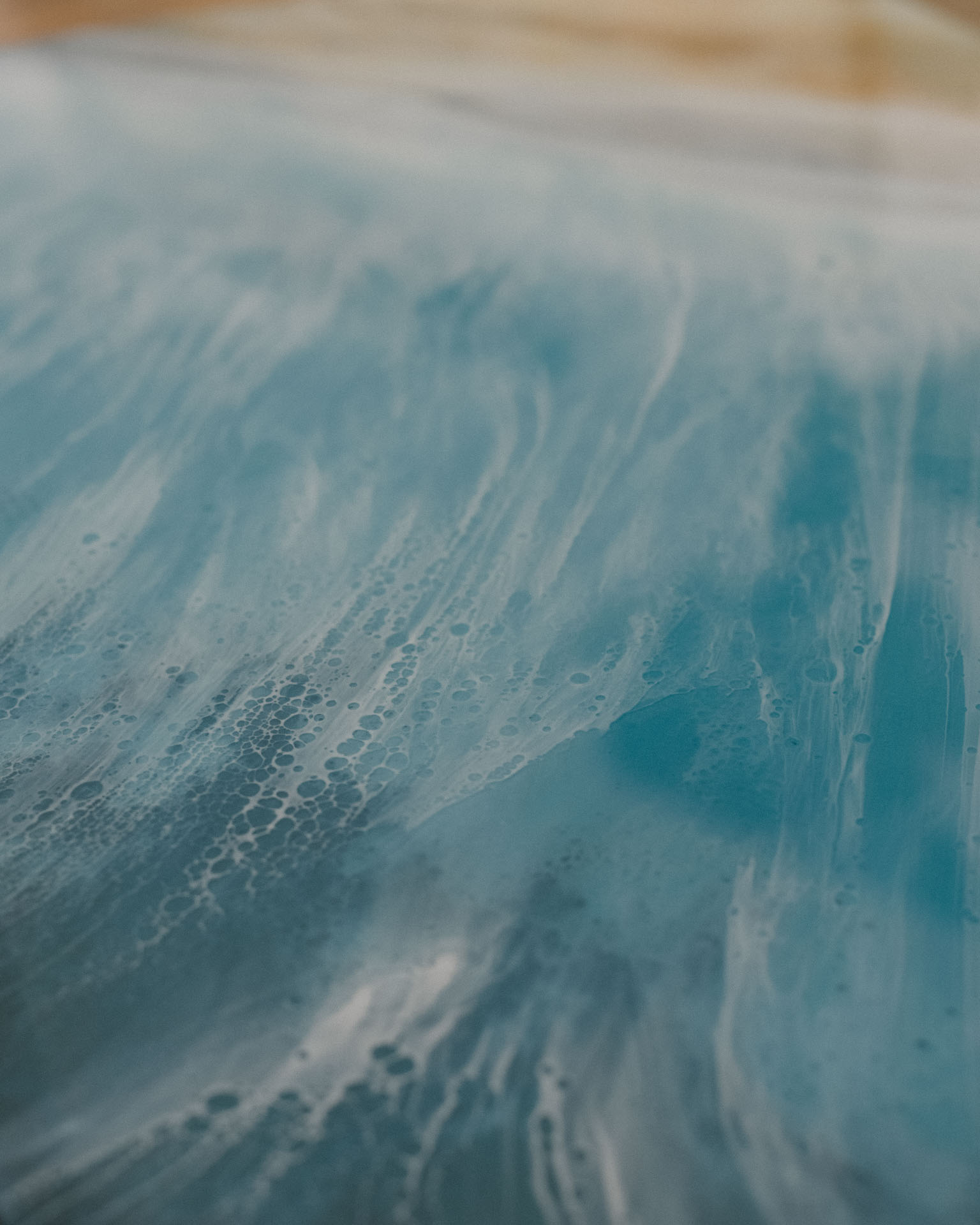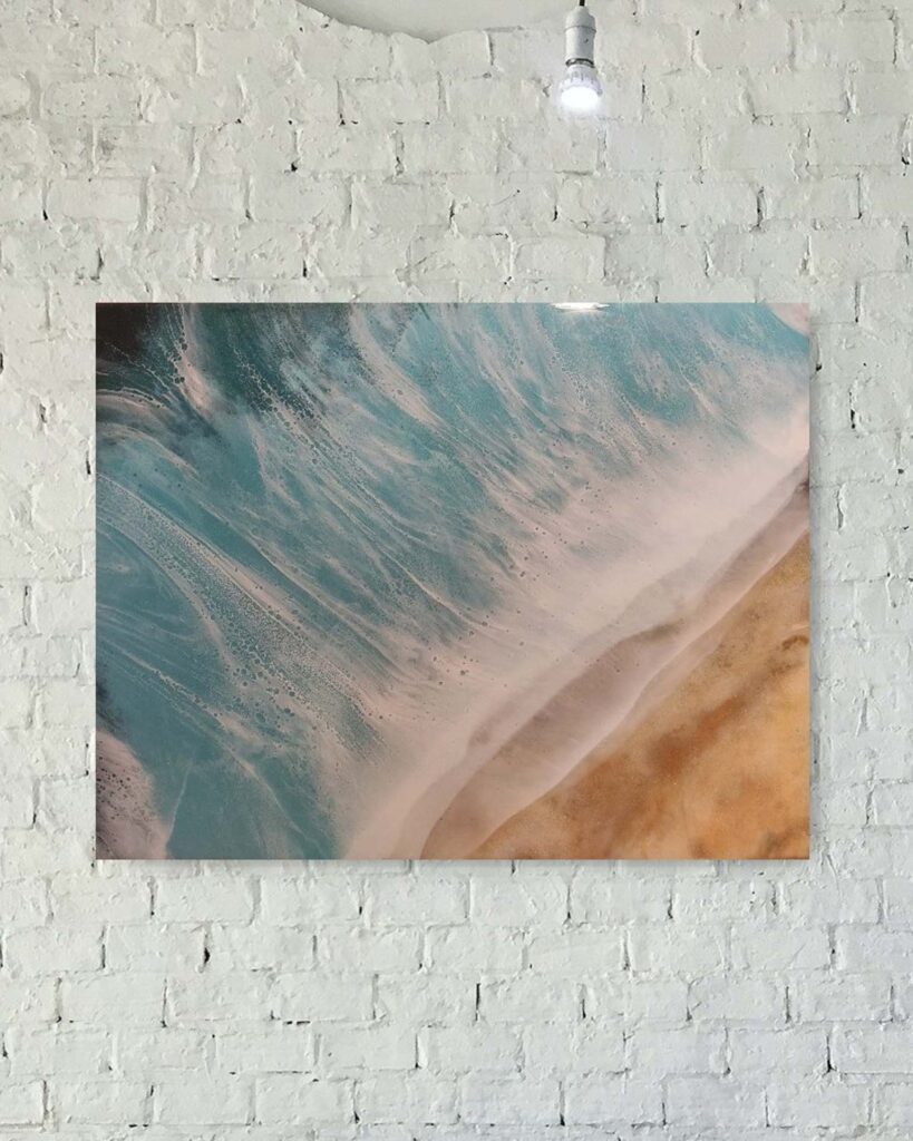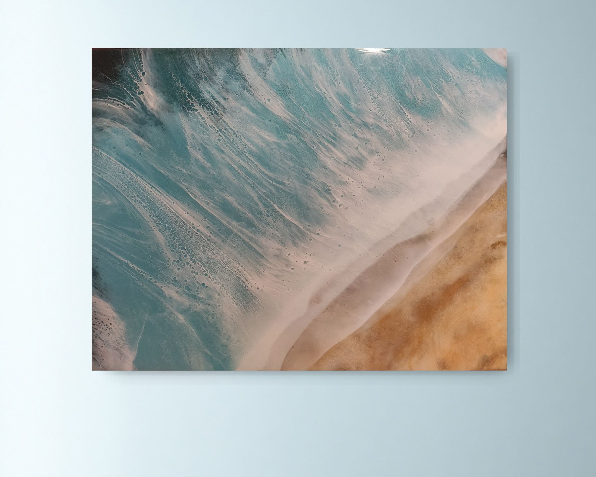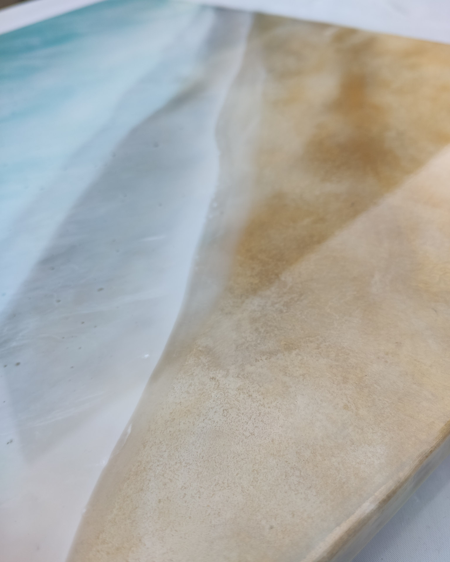 “La Playa” – w języku hiszpańskim oznacza plażę. Obraz wykonany z żywicy epoksydowej z odbciem lustrzanym, zabezpieczony Top Coat z ochroną przed promieniowaniem UV. Obraz w kolorze błękitno-złotym z akcentami metalicznymi.